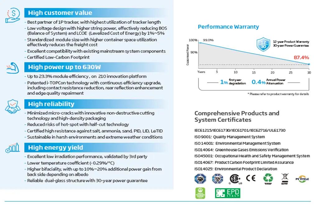 | Parameter | Efficiency | Bifacial Gain | Degradation(Year 1) | Warranty |